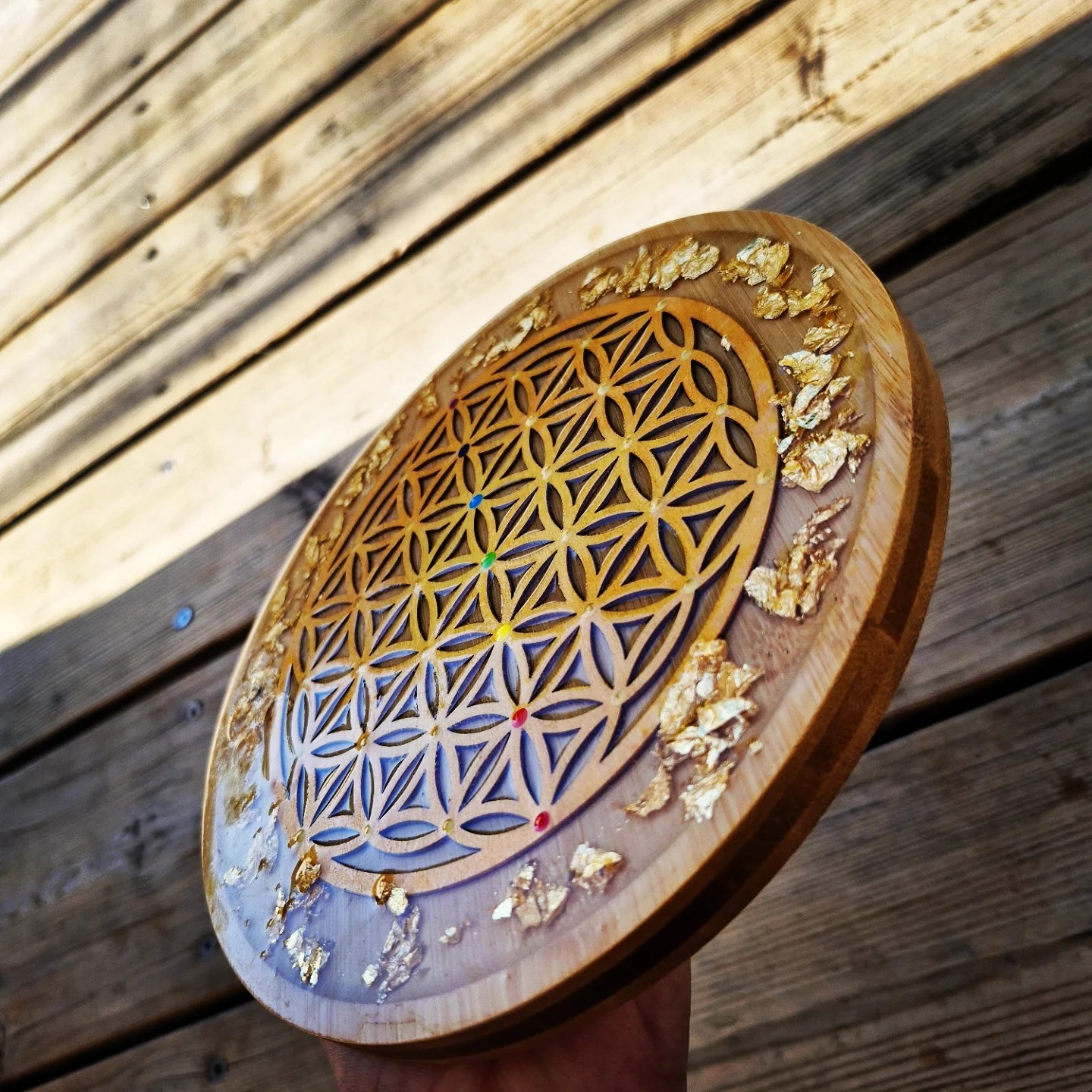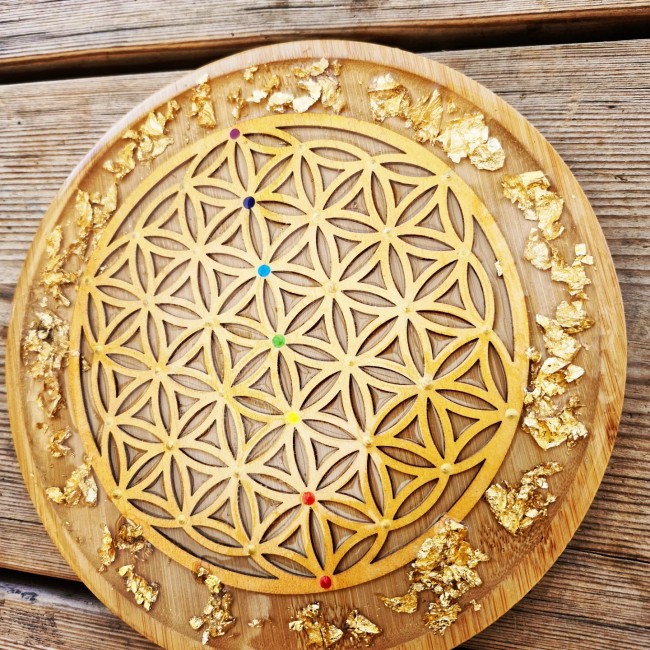Plateau de rechargement en Bambou avec sa Fleur de Vie en Bois Naturel Feuilles d'Or et Chakras résine epoxy.