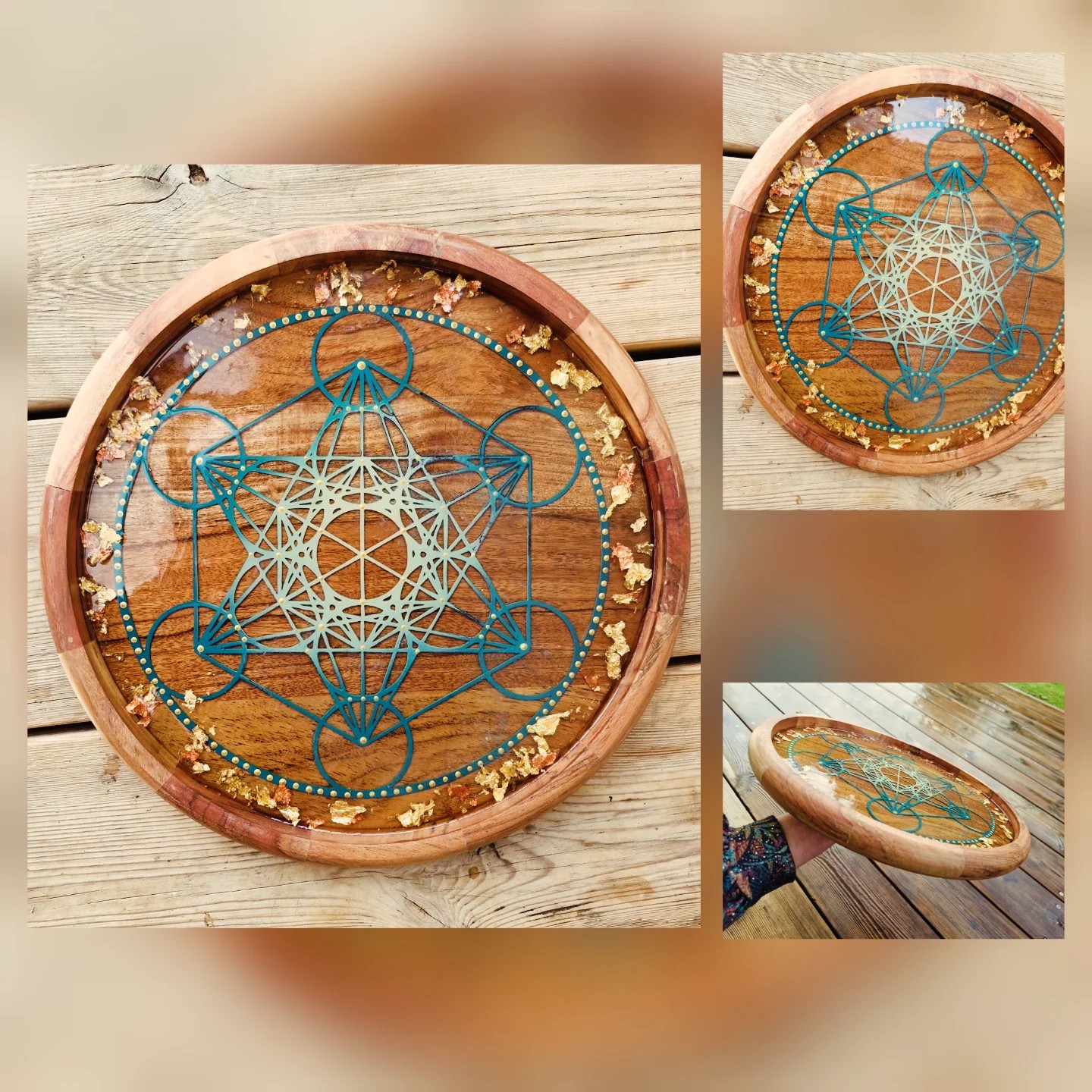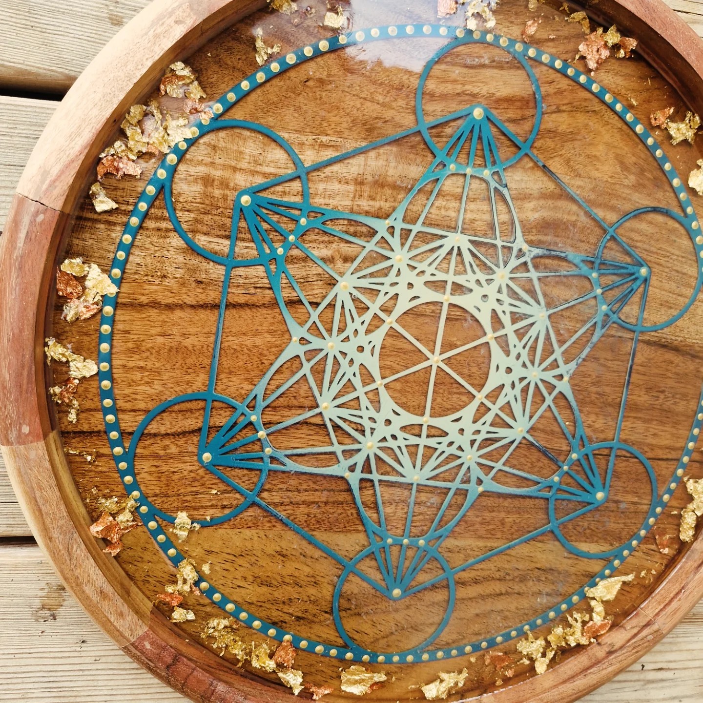 Plateau de rechargement avec son Cube de Métatron Feuilles de Cuivre et D'Or résine epoxy.