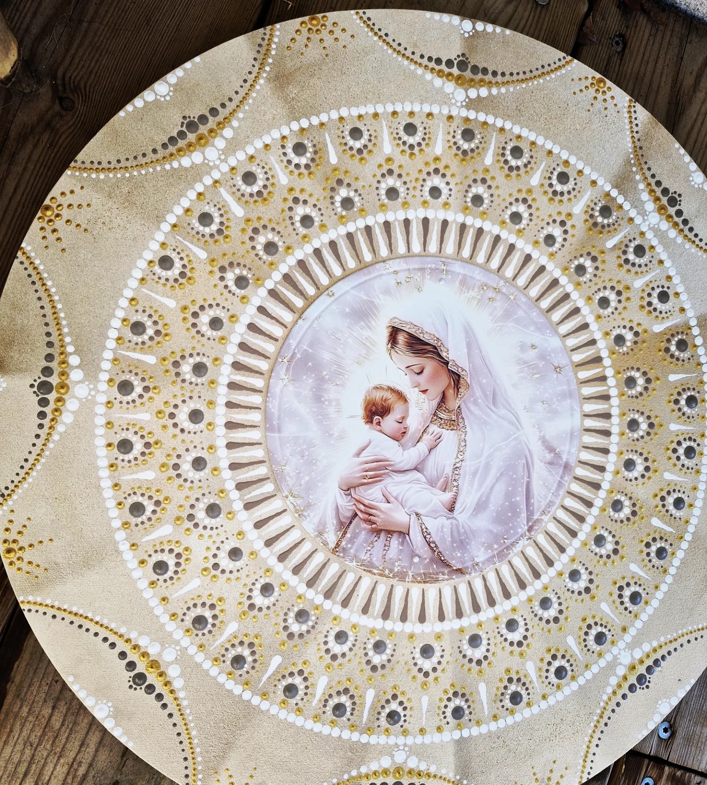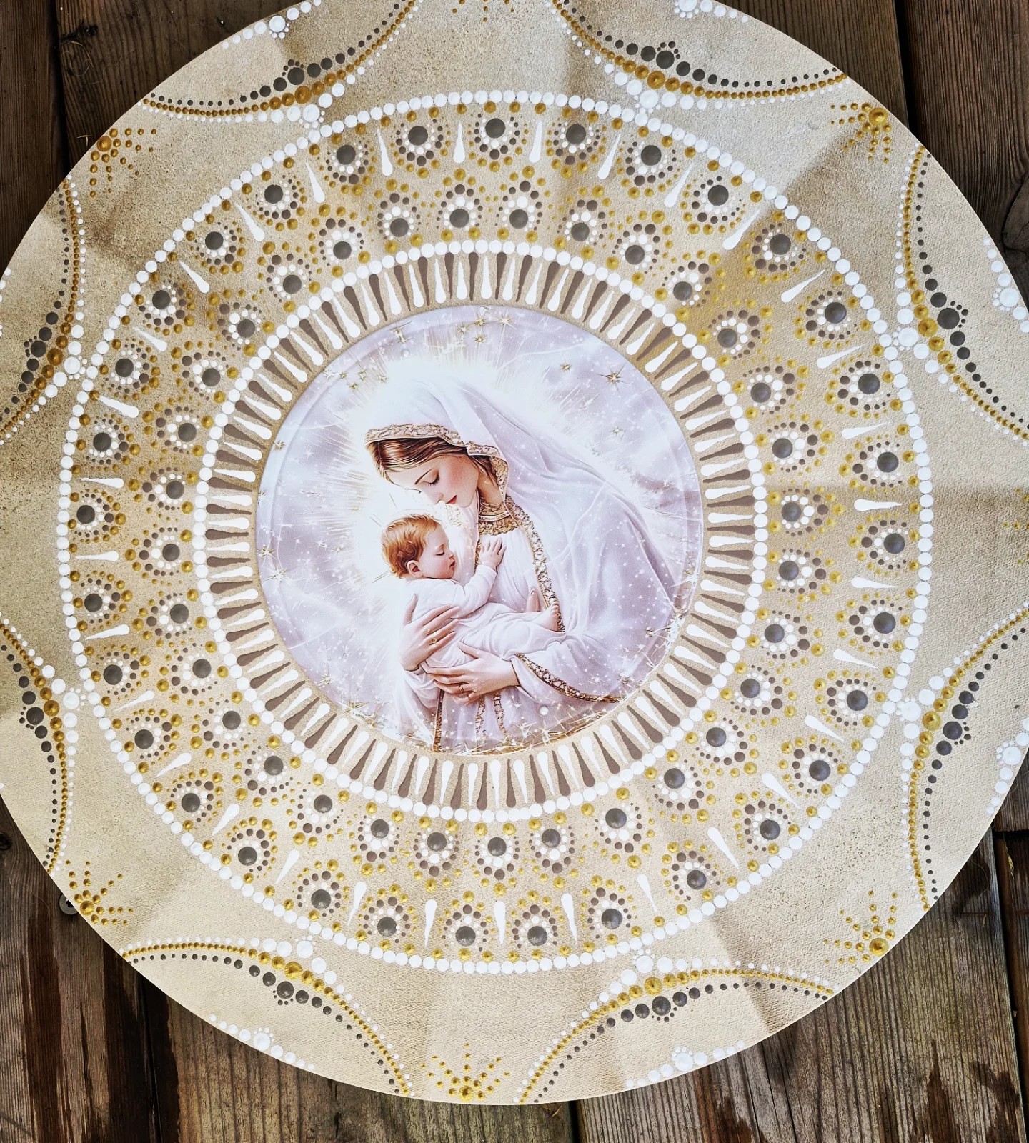Le mandala, par sa géométrie sacrée et ses points lumineux, diffuse une vibration d’apaisement, de protection et de paix intérieure.