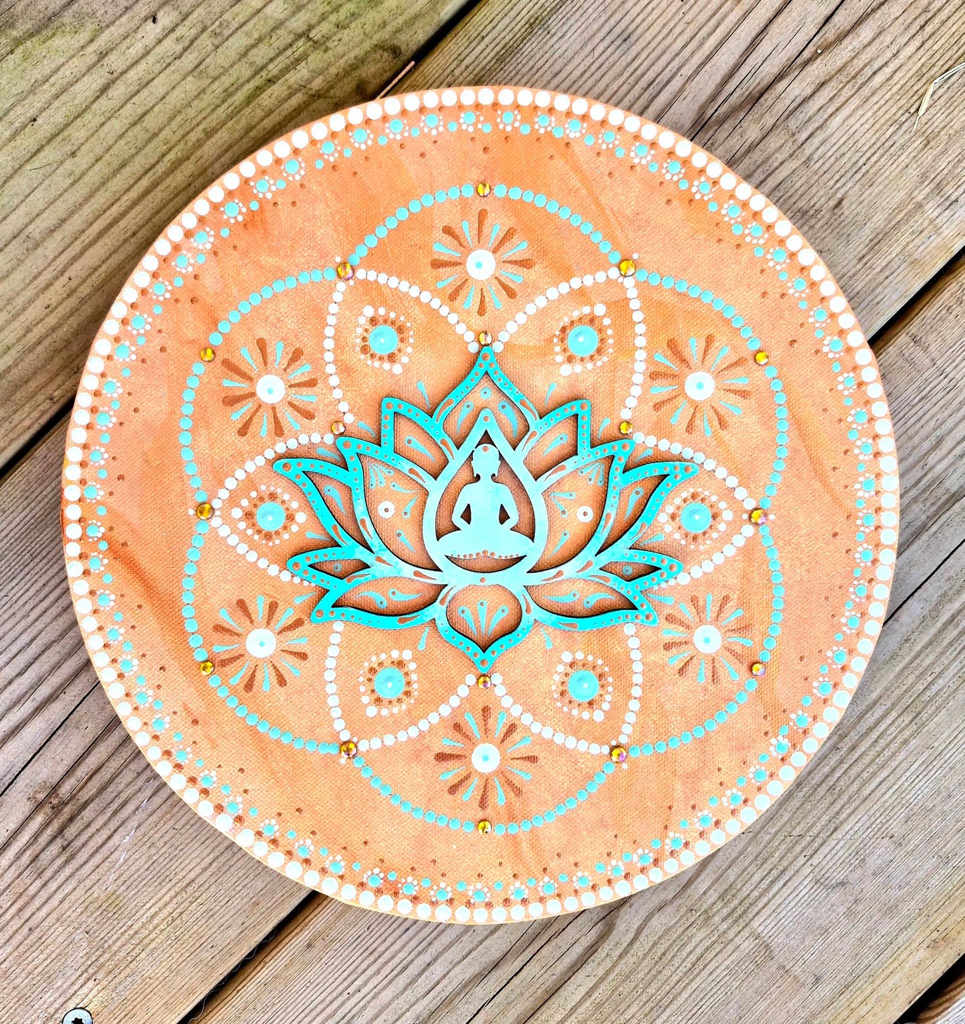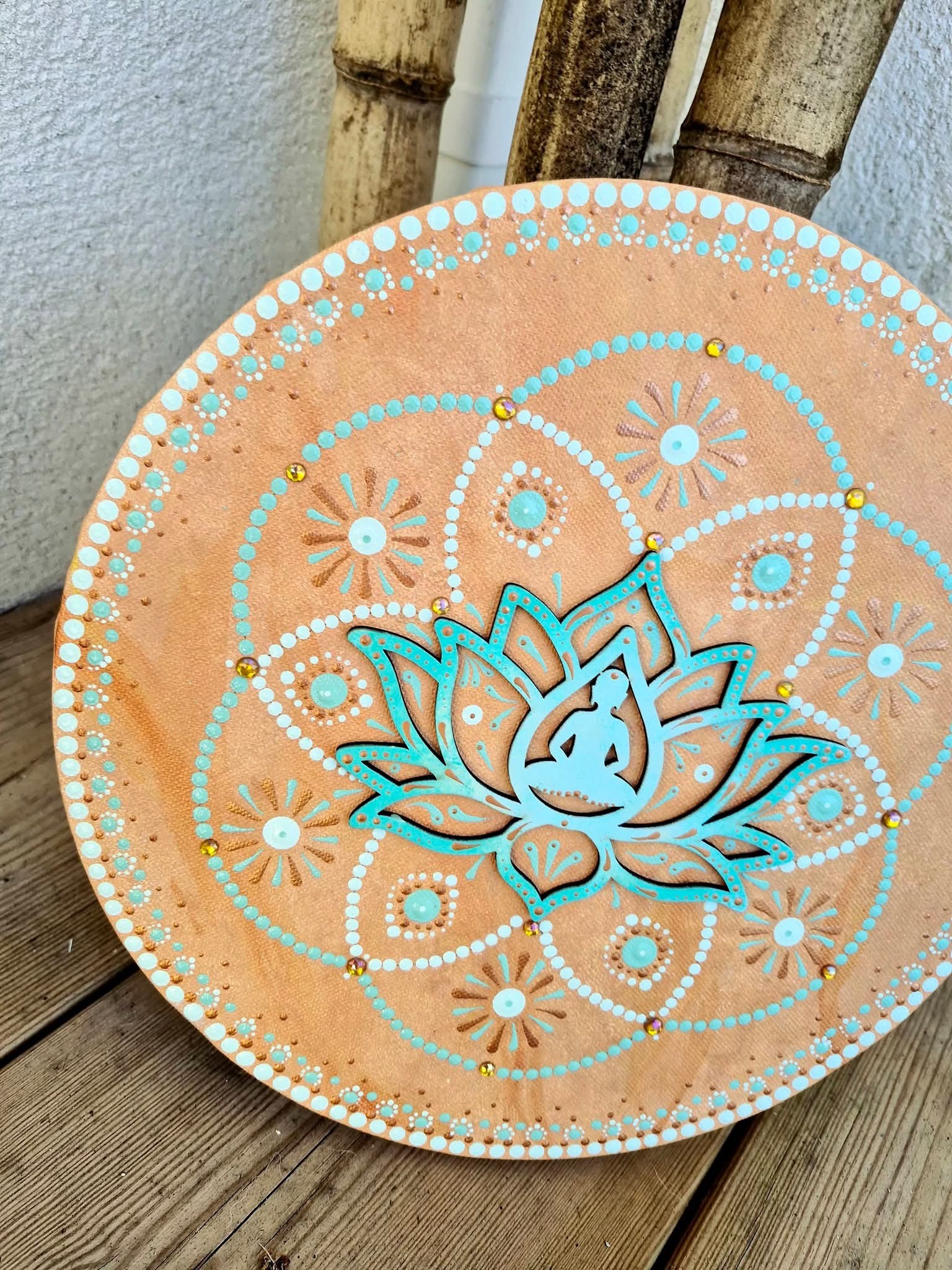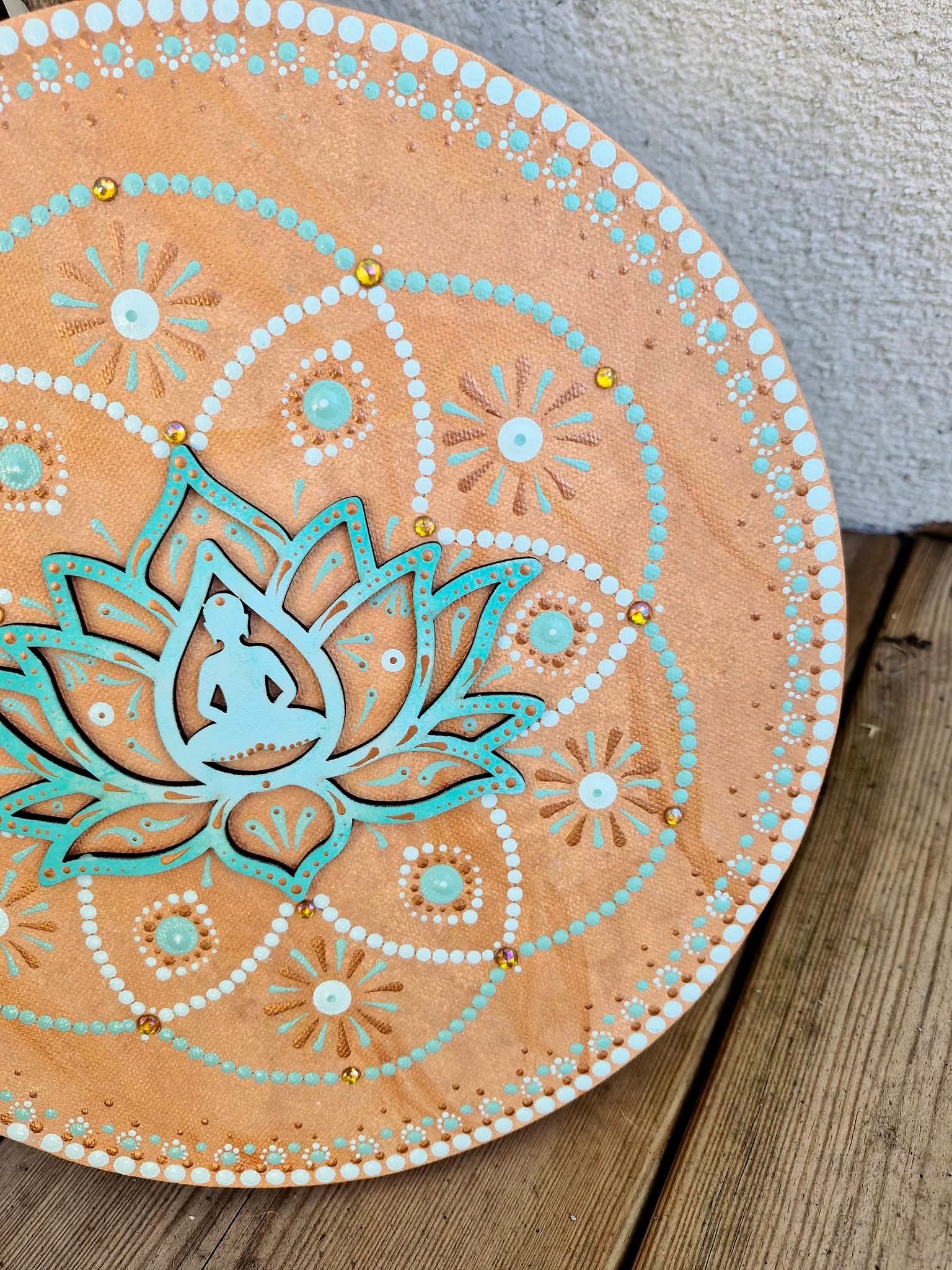 Cette toile vibratoire invite au recentrage, à l’ouverture du cœur et à la reconnexion à la paix intérieure, à travers la symbolique du lotus et la géométrie sacrée.