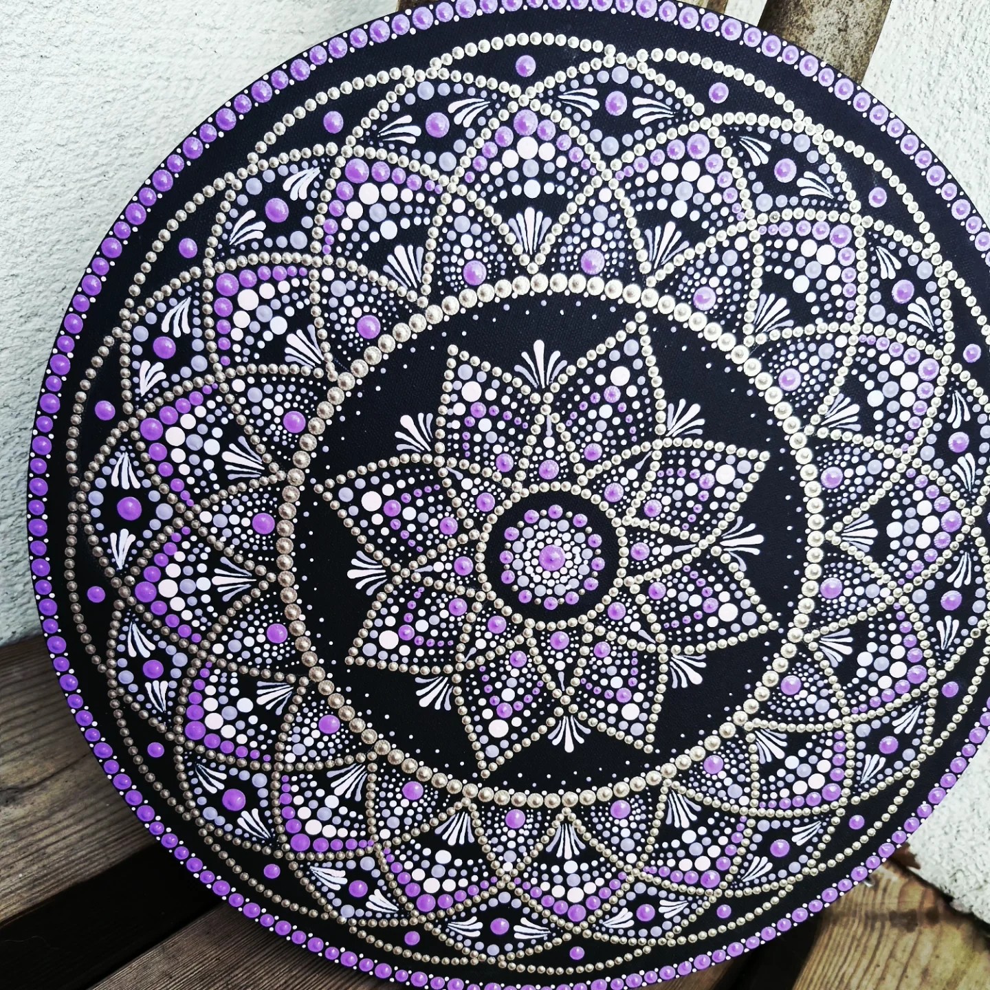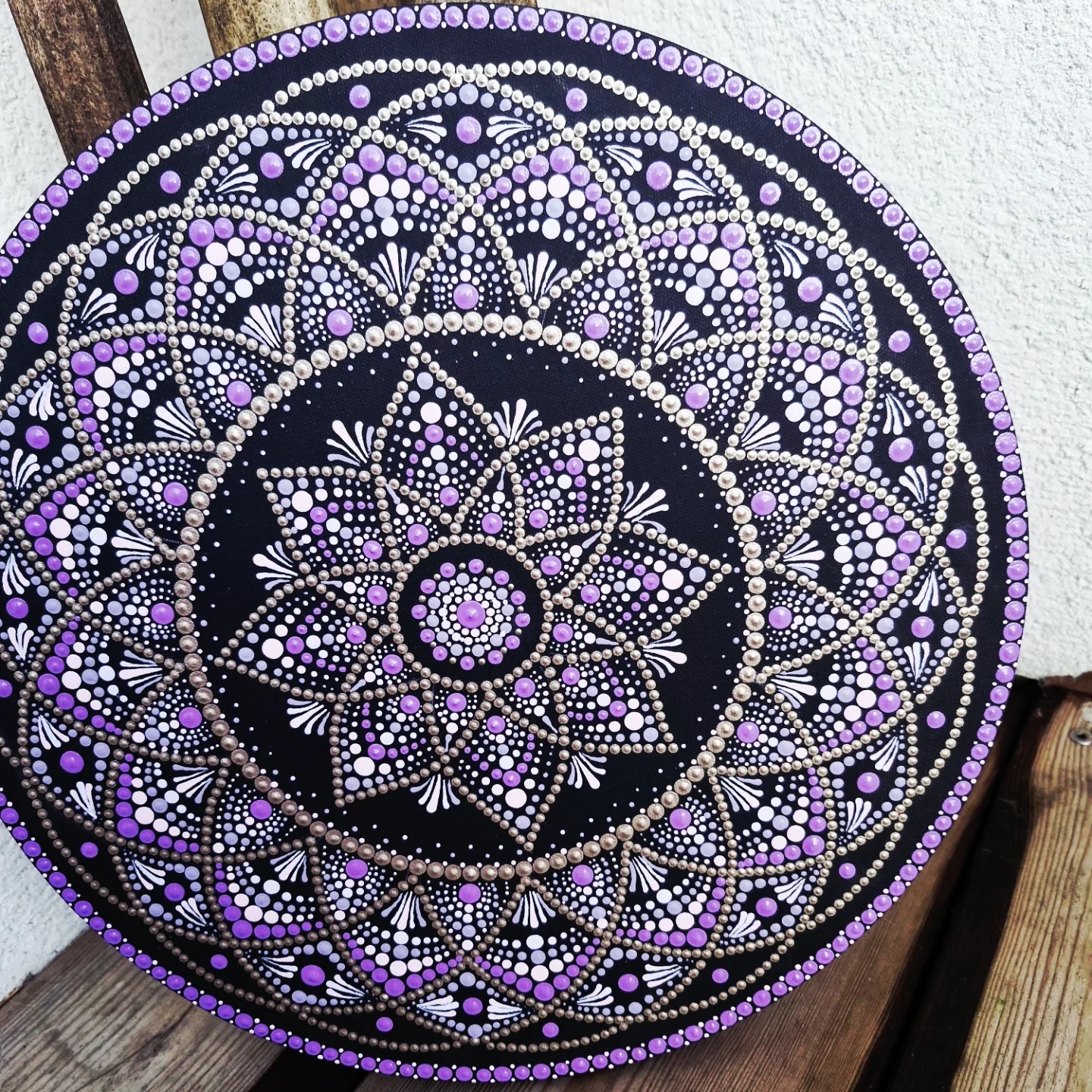 💜 Le mandala s’organise autour d’un cœur central rayonnant, symbole de l’âme et de la conscience en expansion. Les nuances de violet invitent à la transmutation, à l’ouverture de l’intuition et à la connexion aux plans subtils, tandis que les points nacrés ancrent l’énergie dans la matière.