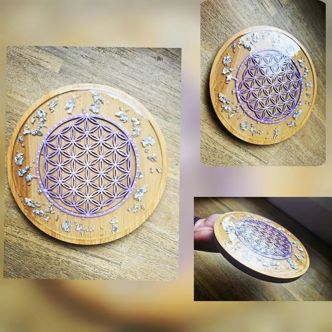 Plateau de rechargement en Bambou avec sa Fleur de Vie Feuilles D'Argent et résine epoxy.