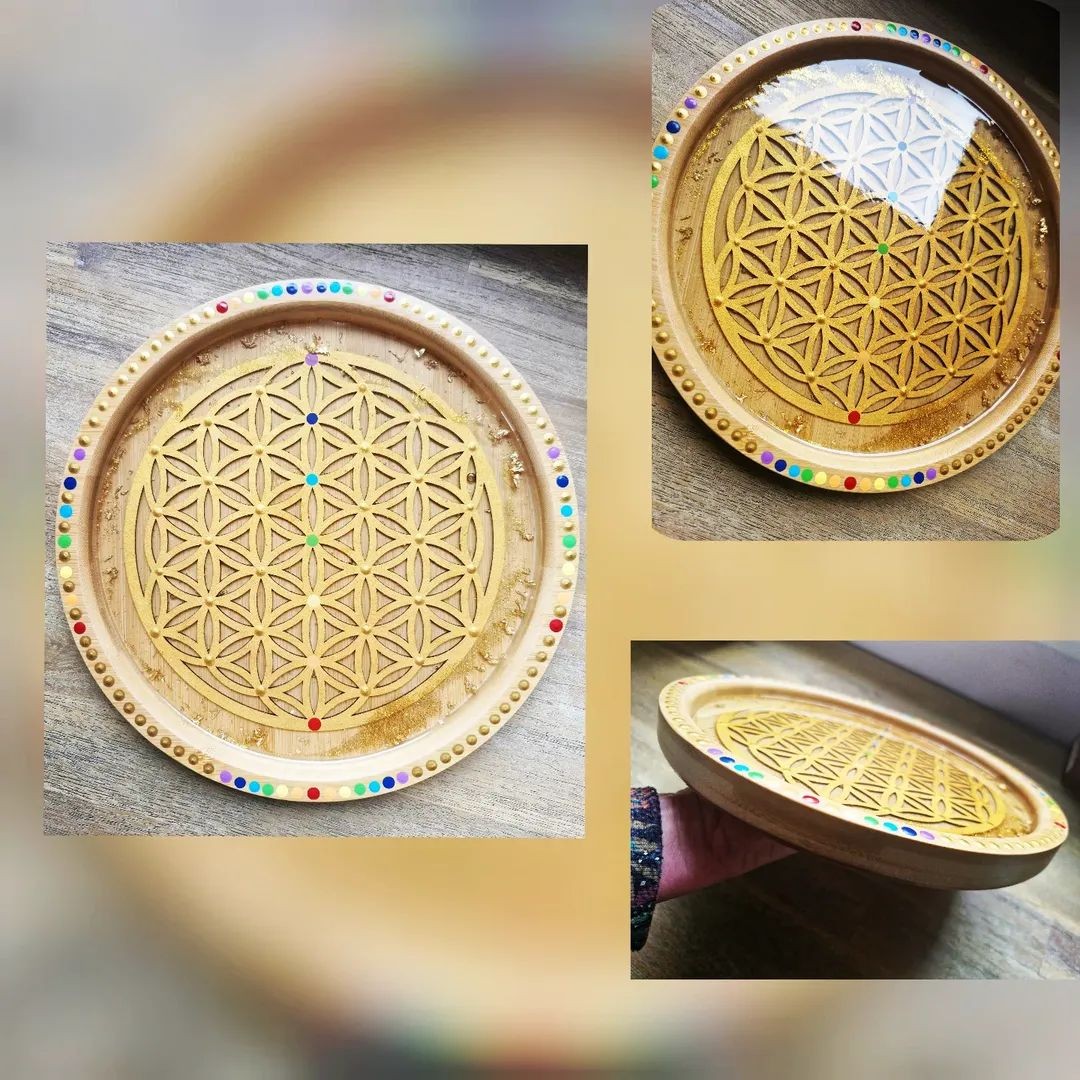 Plateau de rechargement en Bambou avec sa Fleur de Vie Feuilles D'Or et paillettes Or et résine epoxy.