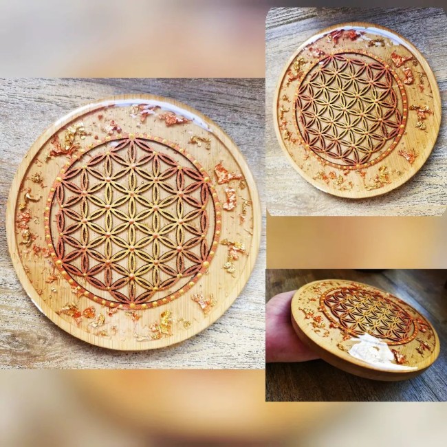 Plateau de rechargement en Bambou avec son Cube de Métatron Feuilles D'Or et de Cuivre et résine epoxy.