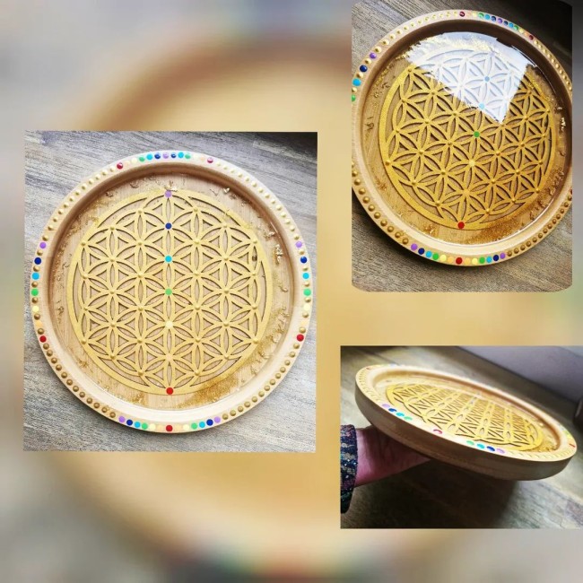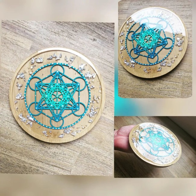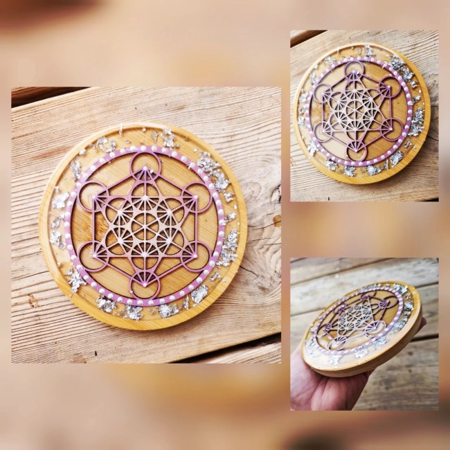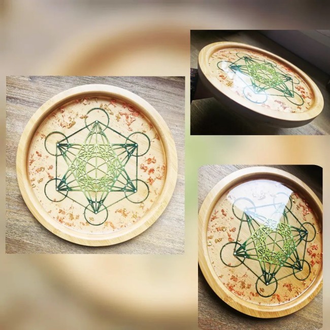 Plateau de rechargement en Bambou avec son Cube de Métatron Feuilles D'Argent résine epoxy.