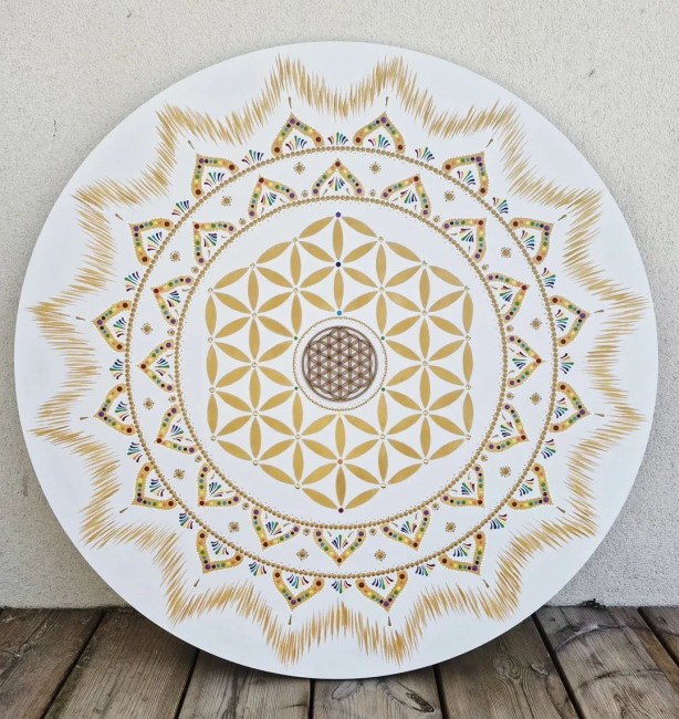 Peinture Vibratoire Fleur de Vie Pierres Chakras naturelles gravées Or 110cm